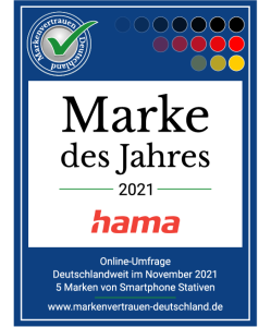 Für die 759 Teilnehmer der repräsentativen Umfrage vom 30. Oktober 2021 bis zum 30. November 2021 zum Thema Smartphone Stative standen fünf Marken zur Auswahl. Testsieger in der Kategorie Markenvertrauen ist hama und gehört somit zu einer der vertrauenswürdigsten Marken des Jahres 2021. Auf den Plätzen zwei bis fünf sind Rollei, JOBY, Manfrotto und NEEWER. Die genauen Abstimmungswerte können Sie der Grafik am Seitenanfang entnehmen.